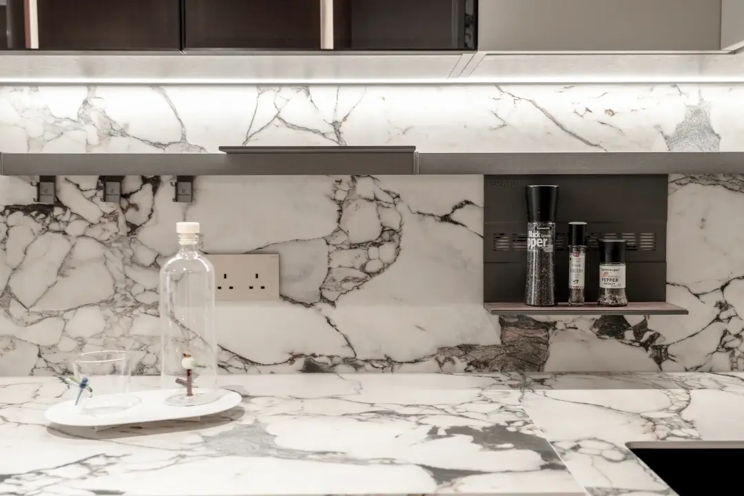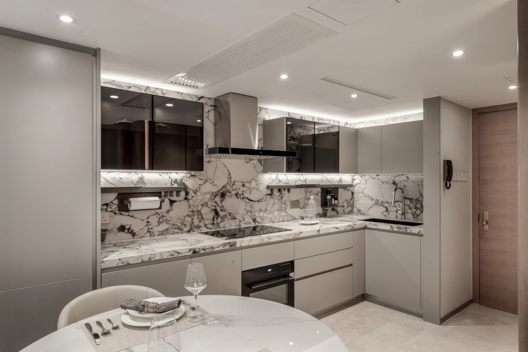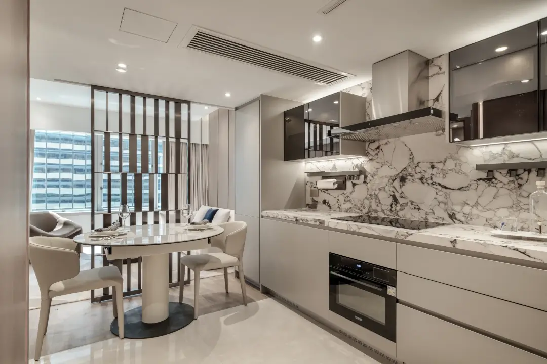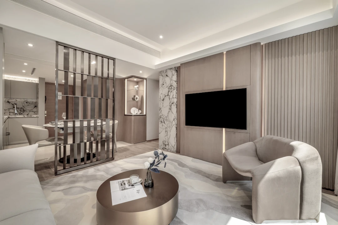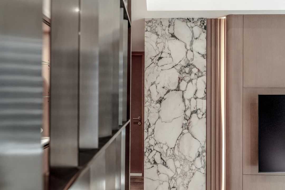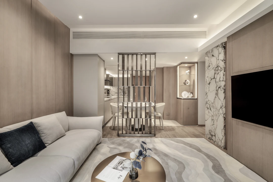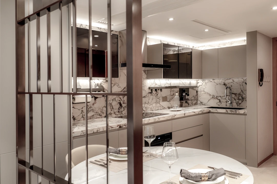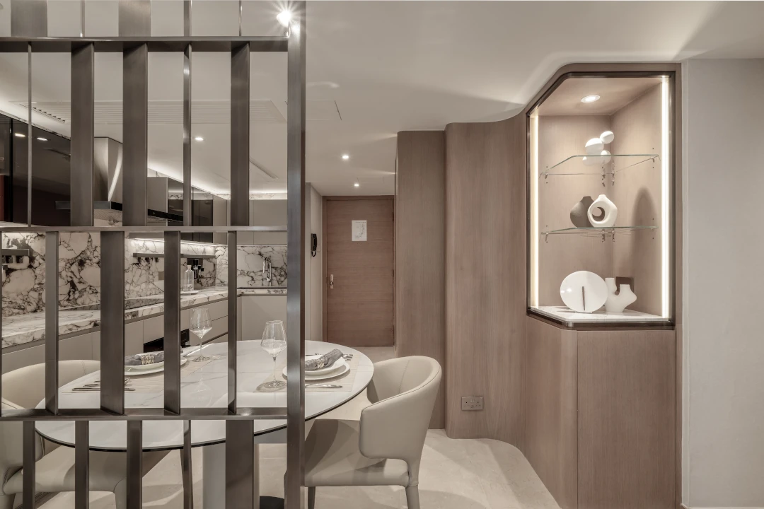 單位的開放式廚房特別搶眼,廚櫃選用紋理較大且較深的岩板石,形成突出而耀眼的效果。開放式廚房不僅增強了客飯廳的空間感,還使整體環境更加通透。為了在需要時能夠靈活分隔空間,設計師Danny選擇了一幅古銅鋼材質的褸空百葉屏風,讓戶主一進入單位就能看到明顯的焦點,拉上時可輕易劃出用餐區的獨立空間。