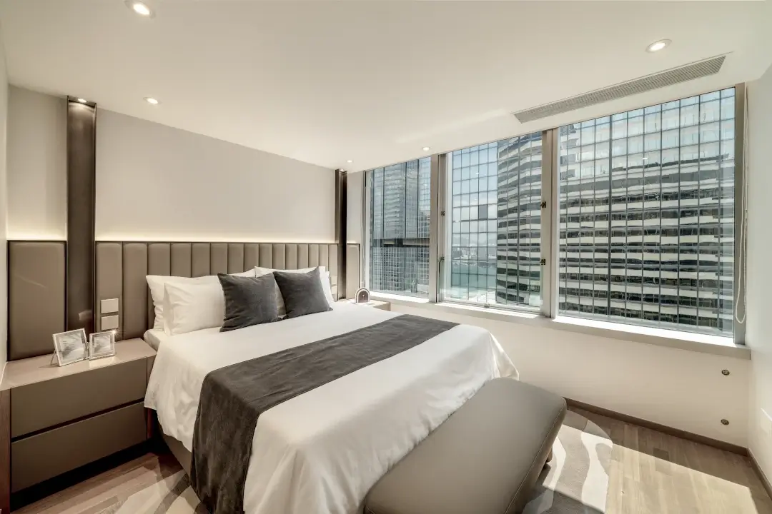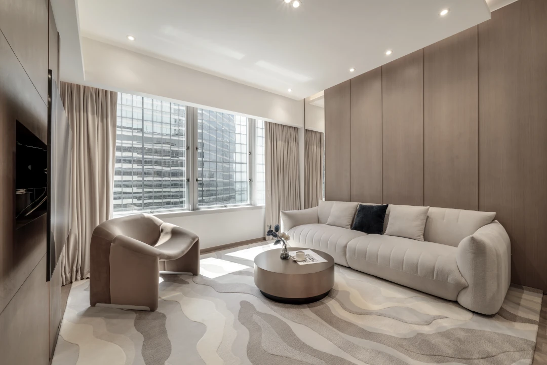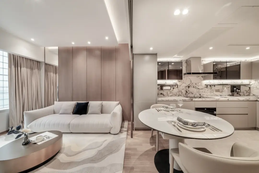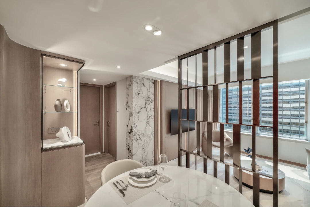 會景閣位於灣仔,面積約600呎,戶主二人居住,期望將此服務式住宅打造成在香港的私人酒店。整體設計以奶油色為主,搭配淺色調與拖肥式木飾面材料,加上雲石和古銅鋼等元素,營造出輕奢華的酒店氛圍。