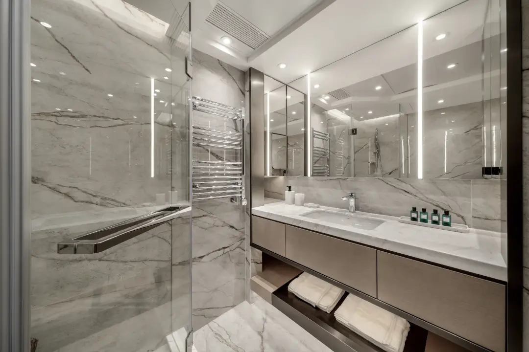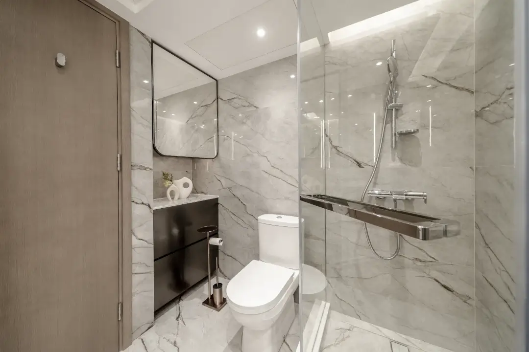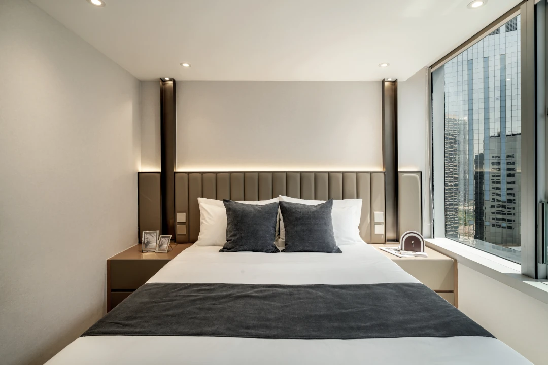 主人房則以深卡其色為主要色調,浴室則選用淺灰色瓷磚,進一步營造出酒店般的感覺。全屋設計風格統一,既具備酒店的實用性,又不失家的溫暖舒適氛圍。